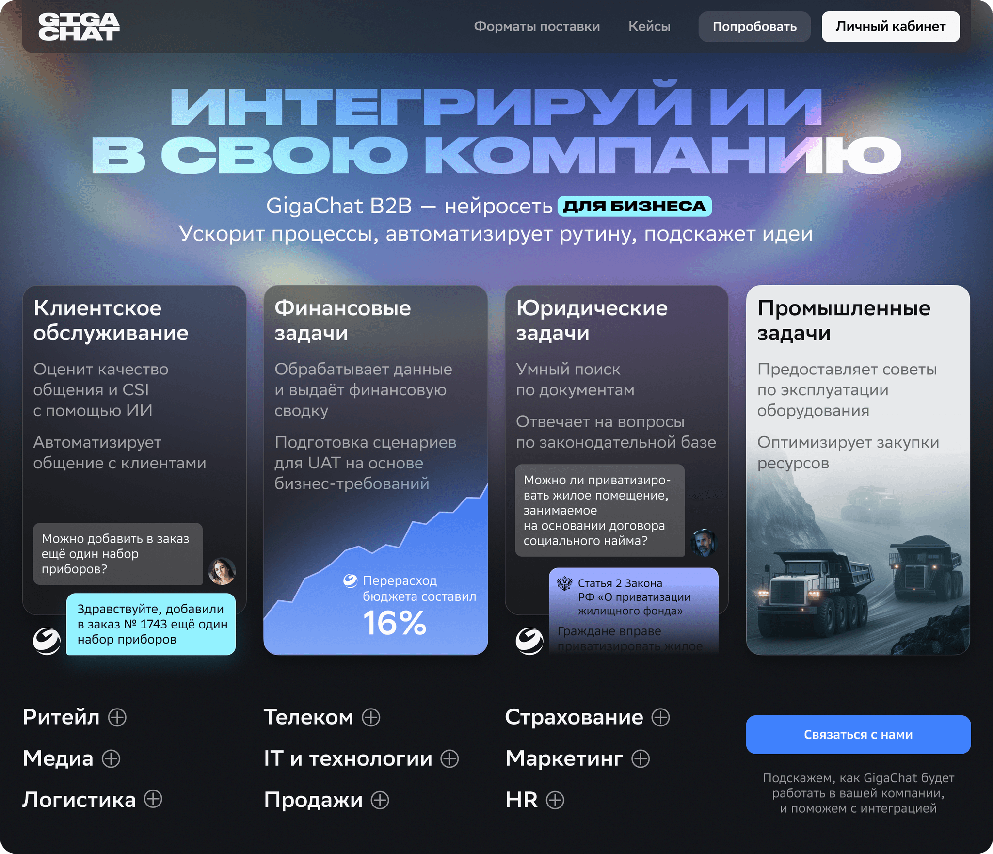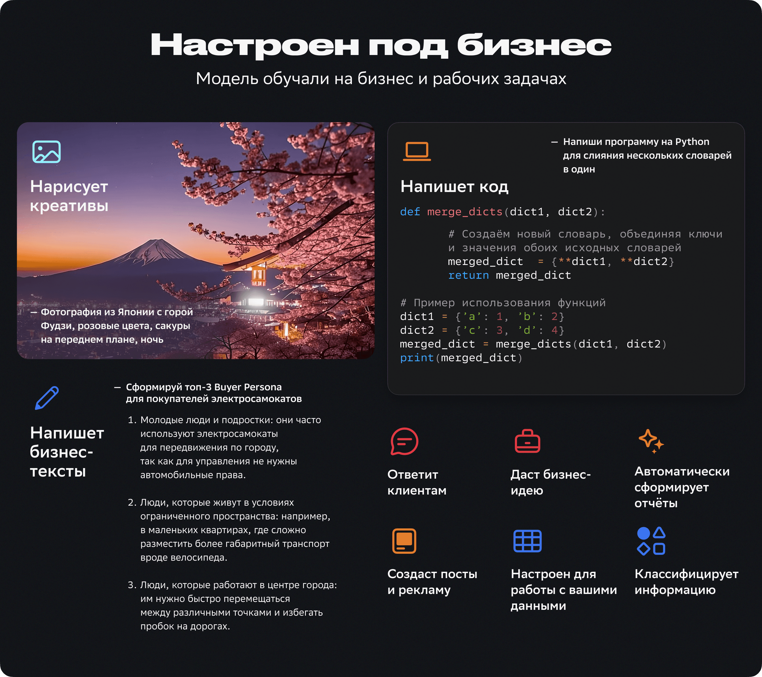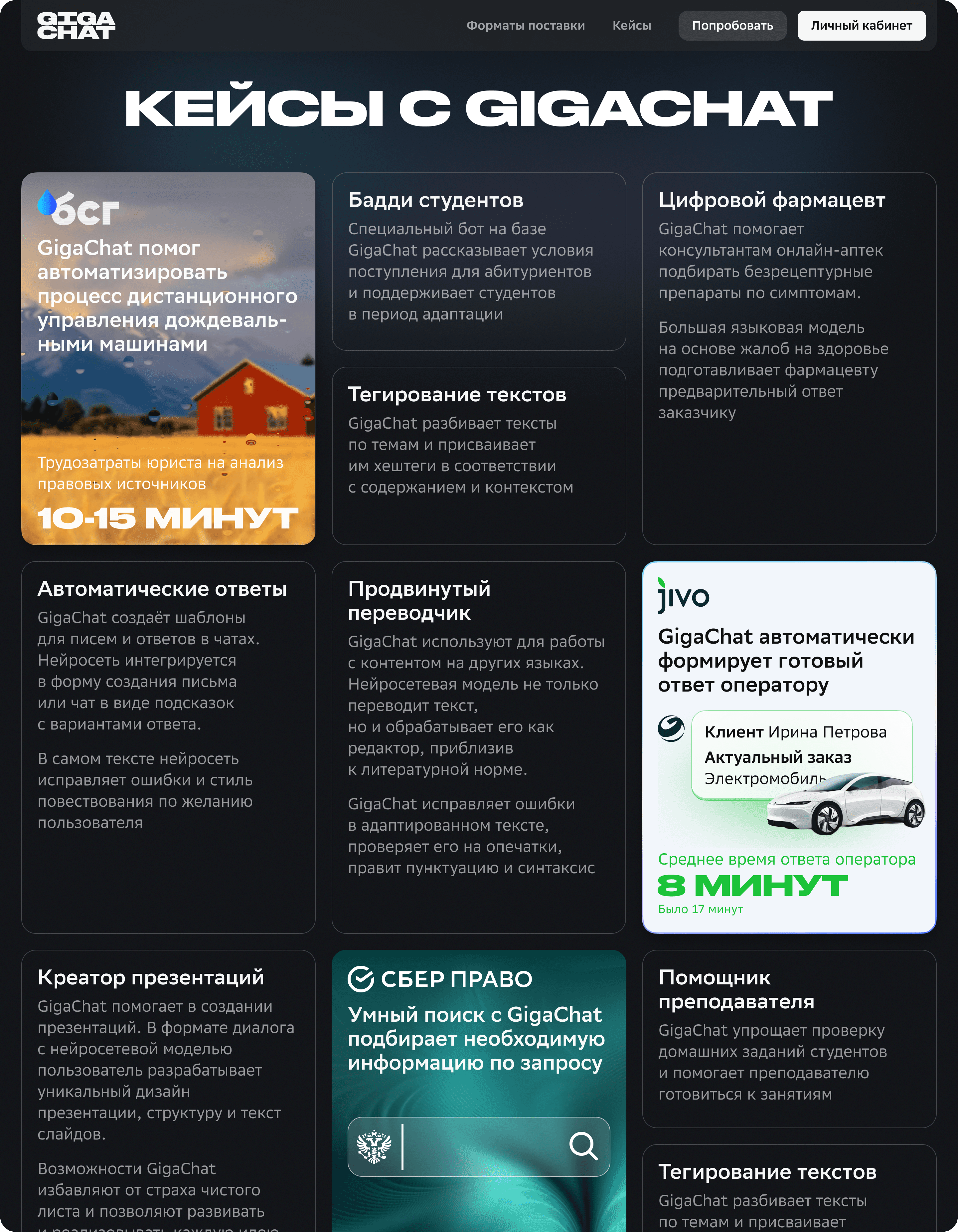 Показываем реальные примеры из разных сфер бизнеса. Блок нацелен показать разнообразие задач с которым справится наша нейросеть. Даже если не попадём в потребность клиента, то явно покажем, что гигачату многое по плечу.